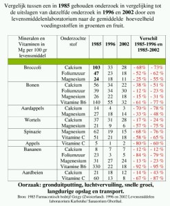 langdurig opgeslagen worden voordat ze uiteindelijk worden verkocht. Daarna worden ze vaak nog langer bewaard voordat ze eindelijk worden gegeten. Een laboratoriumonderzoek wees uit dat de historische teruggang van het mineraalgehalte van fruit en groente tussen 1930 en 1987 verbazingwekkend terugnam. Oorzaak: Uitgeputte grond. luchtvervuiling, te snelle groei, langdurige opslag, transport.
